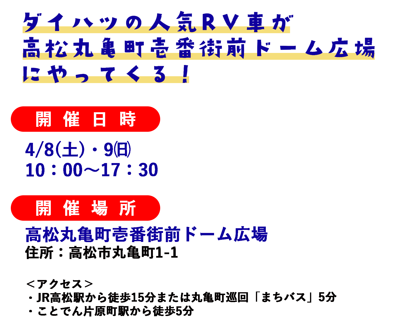 出張展示車両 タント ファンクロス 詳しくはこちら タフト 詳しくはこちら アトレー 詳しくはこちら ロッキー 詳しくはこちら 【4/8(土)限定】 Nibakoが出店します! しあわせお菓子 shinamon様 4/8(土)限定で綾川町のお菓子工房「しあわせお菓子shinamon」様が出張展示会場にご出店くださいます! 3/19㈰に開催された「さぬきマルシェinサンポート」でも、Nibakoでご出店いただきましたが、午前中には完売してしまうほどの大盛況ぶりでした😳 今回の出店では完売次第の終了となりますので、お早めにご来場ください♪ Instagram