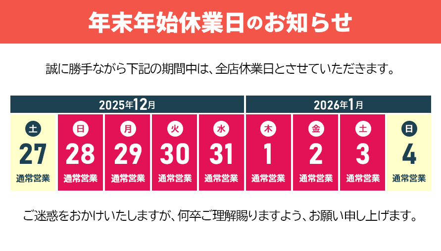 平素より香川ダイハツモータースをご愛顧いただきましてありがとうございます。 誠に勝手ではございますが、2025年12月28日(日)から2026年1月3日(土)までの期間中、全店休業とさせていただきます。 お客様には大変ご迷惑をおかけいたしますが、何卒ご理解・ご了承くださいますようお願い申し上げます。